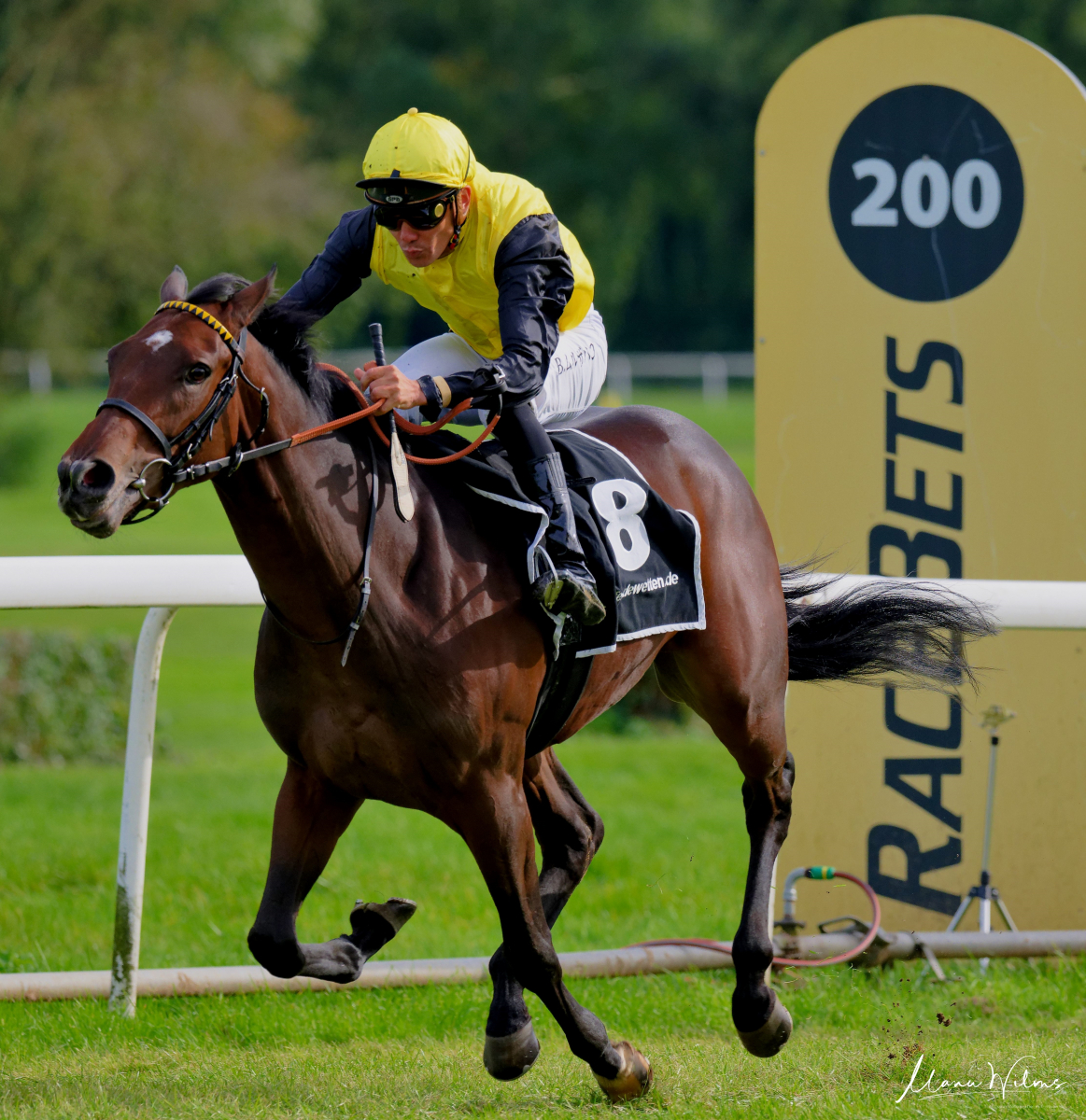 Das vorletzte RaceBets BBAG Auktionsrennen entschied Alexander Pietsch mit „Blömche“ für sich, auch hier wieder ein Außenseiter-Sieg.