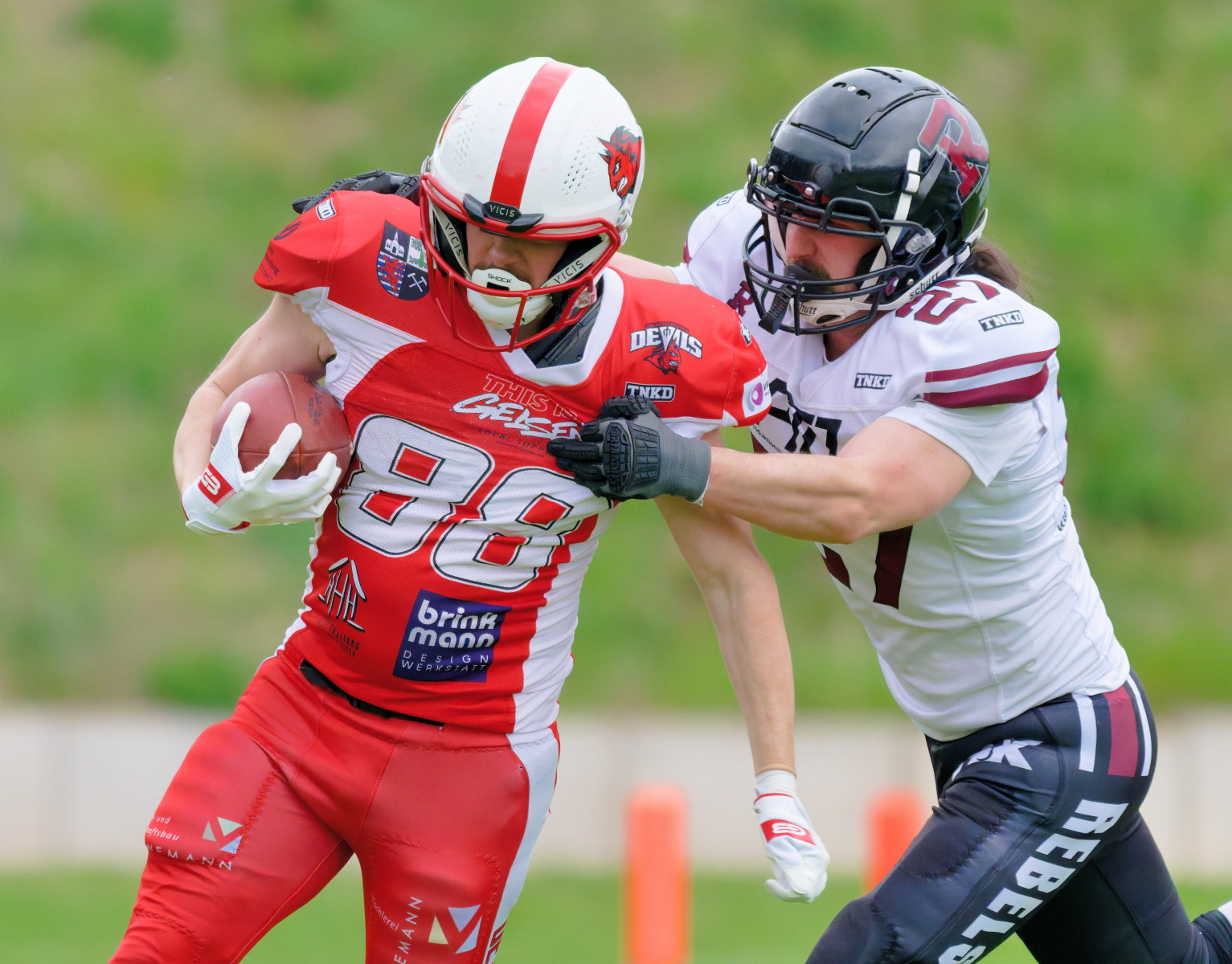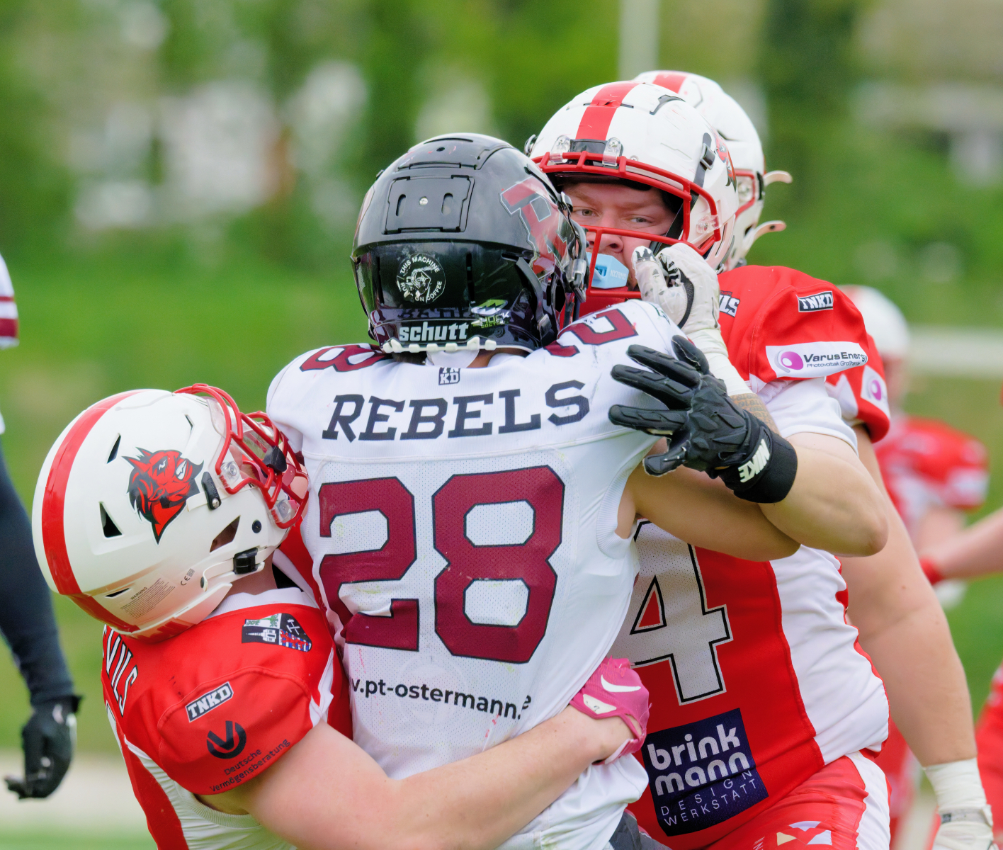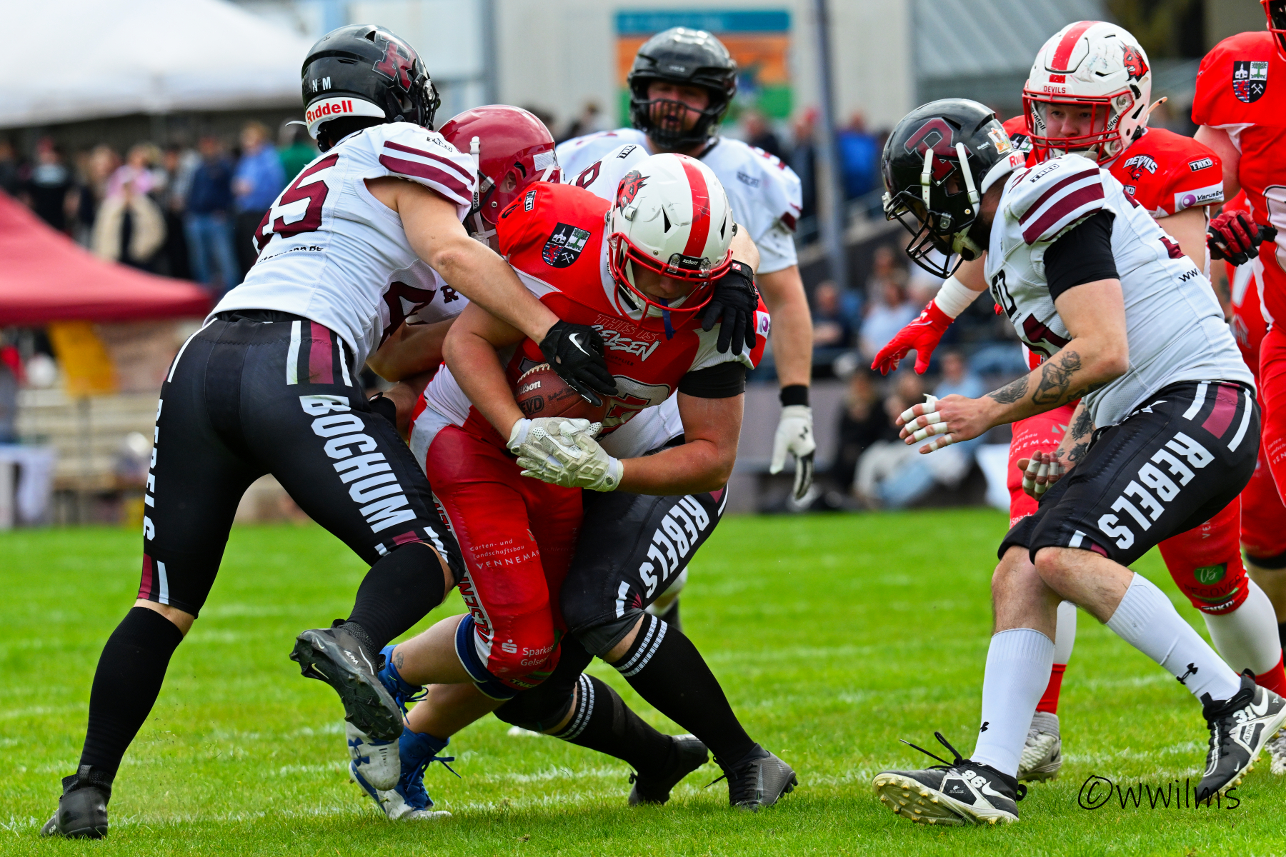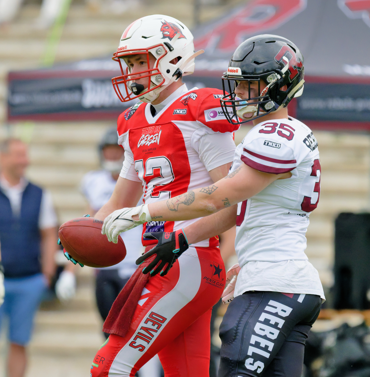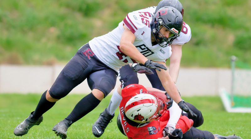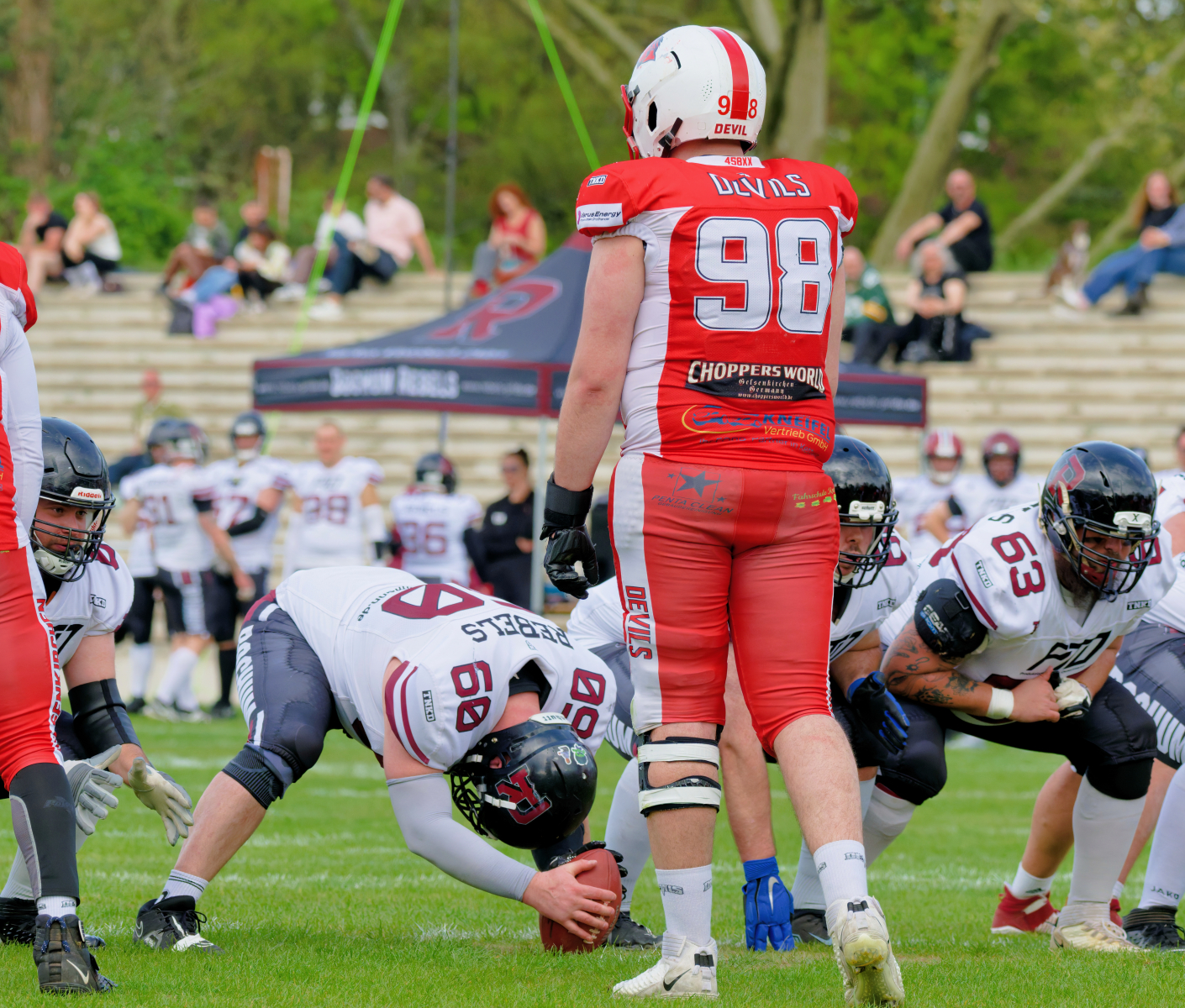 Es folgte zum Ankick um 15:00 Uhr ein Spiel auf Augenhöhe gegen den Oberligisten Bochum Rebels. Beide Teams kämpften in einem offenen Match, doch mit einem glücklicheren Ausgang für die Devils mit einem knappen Sieg von 14:7.
