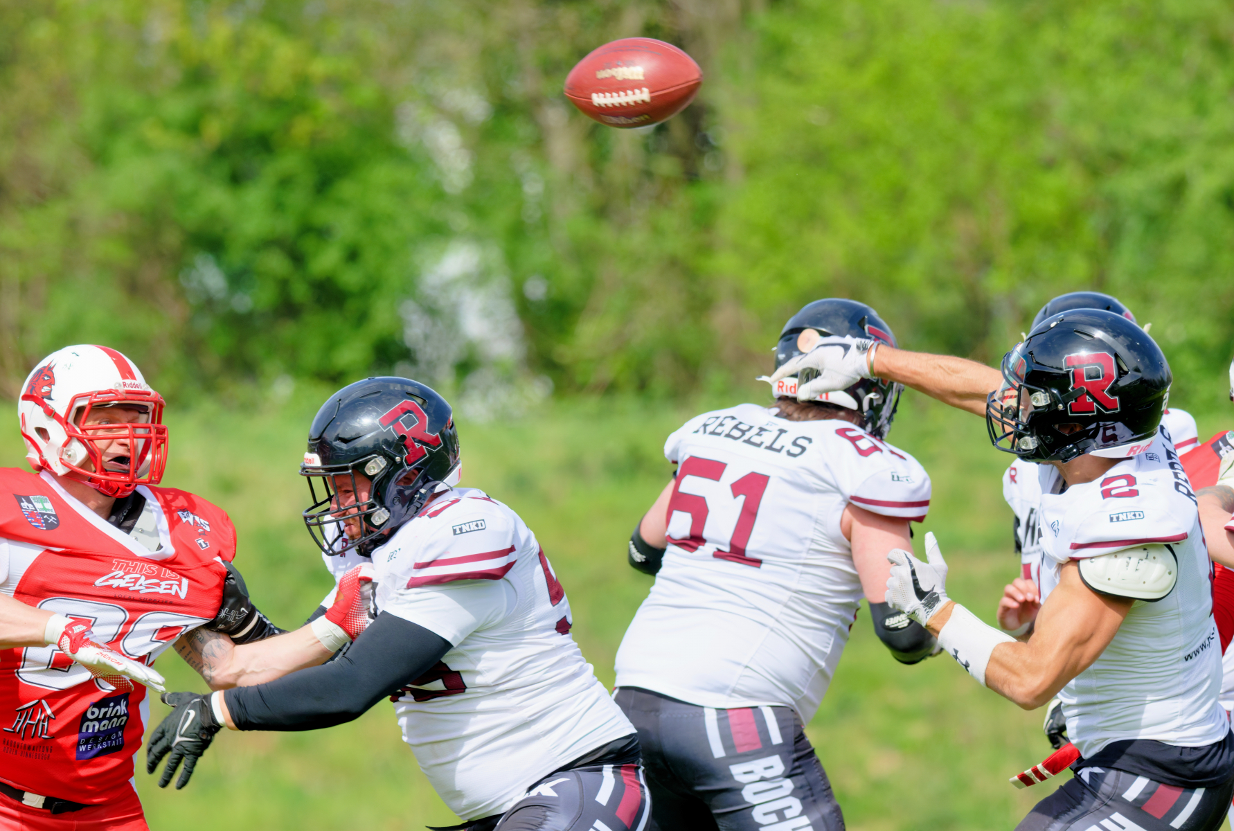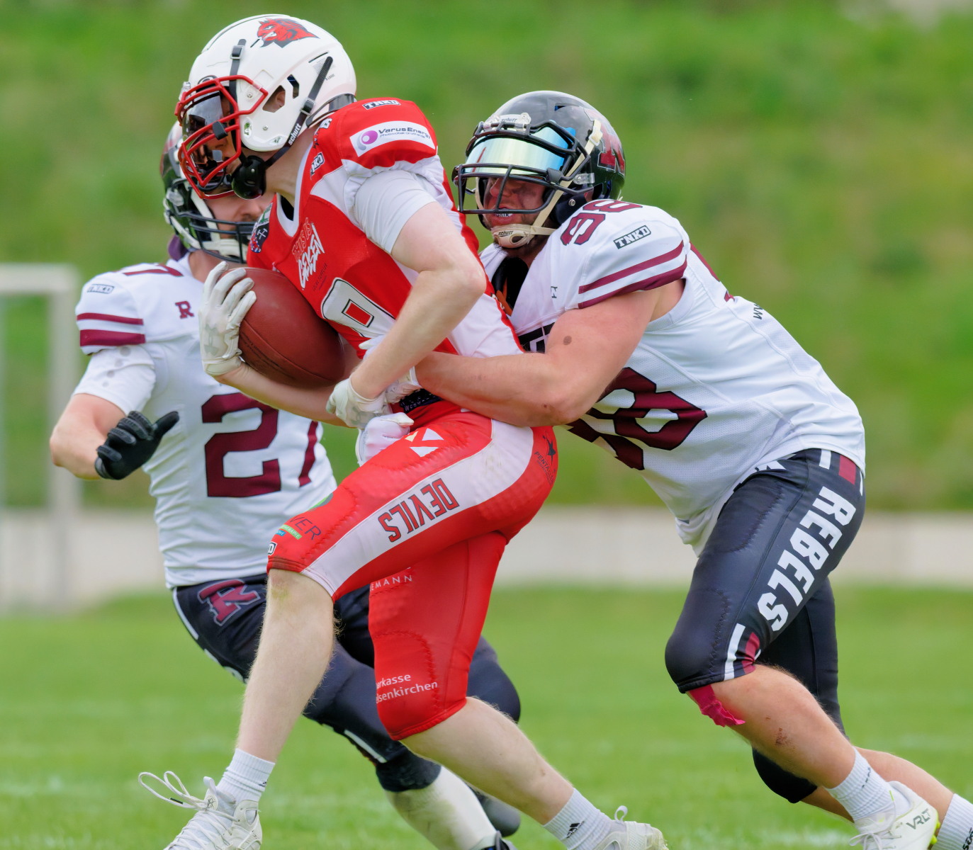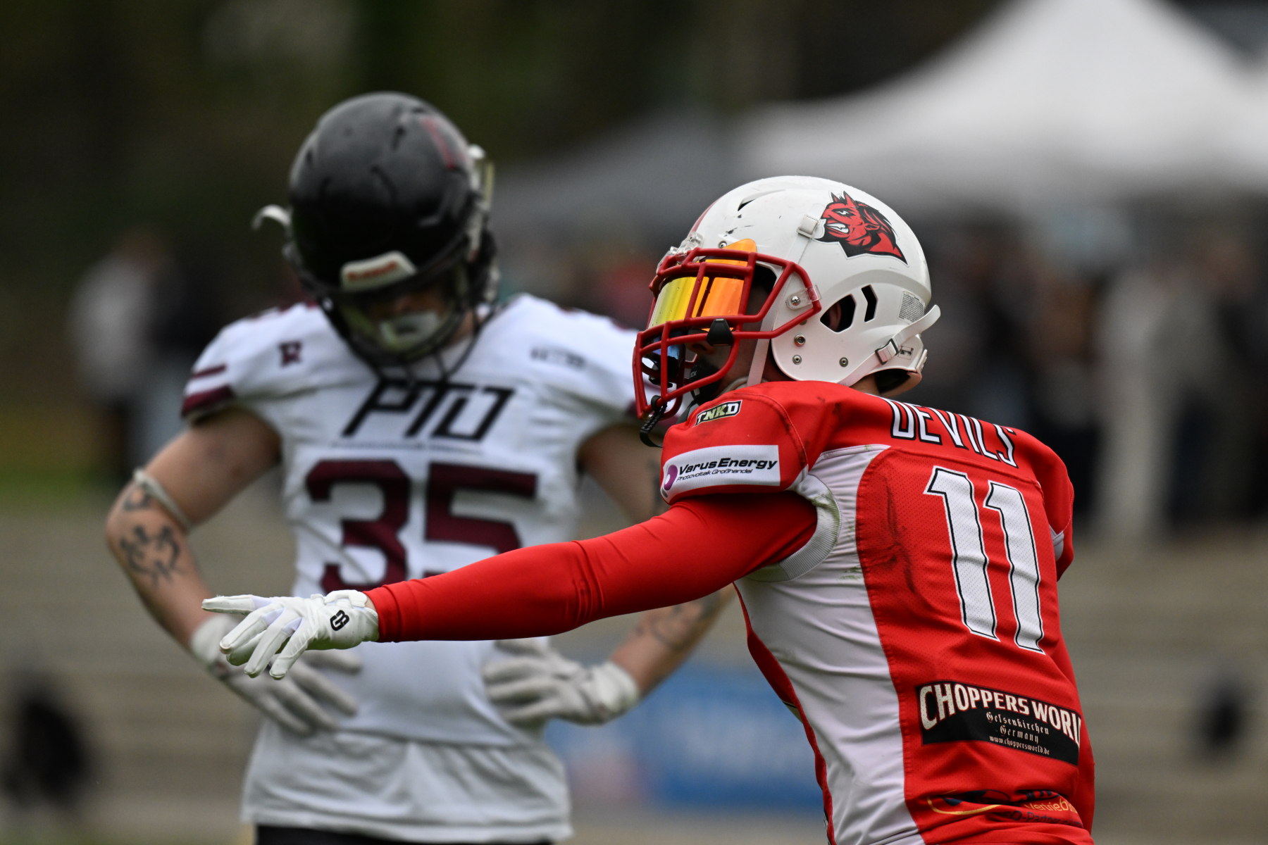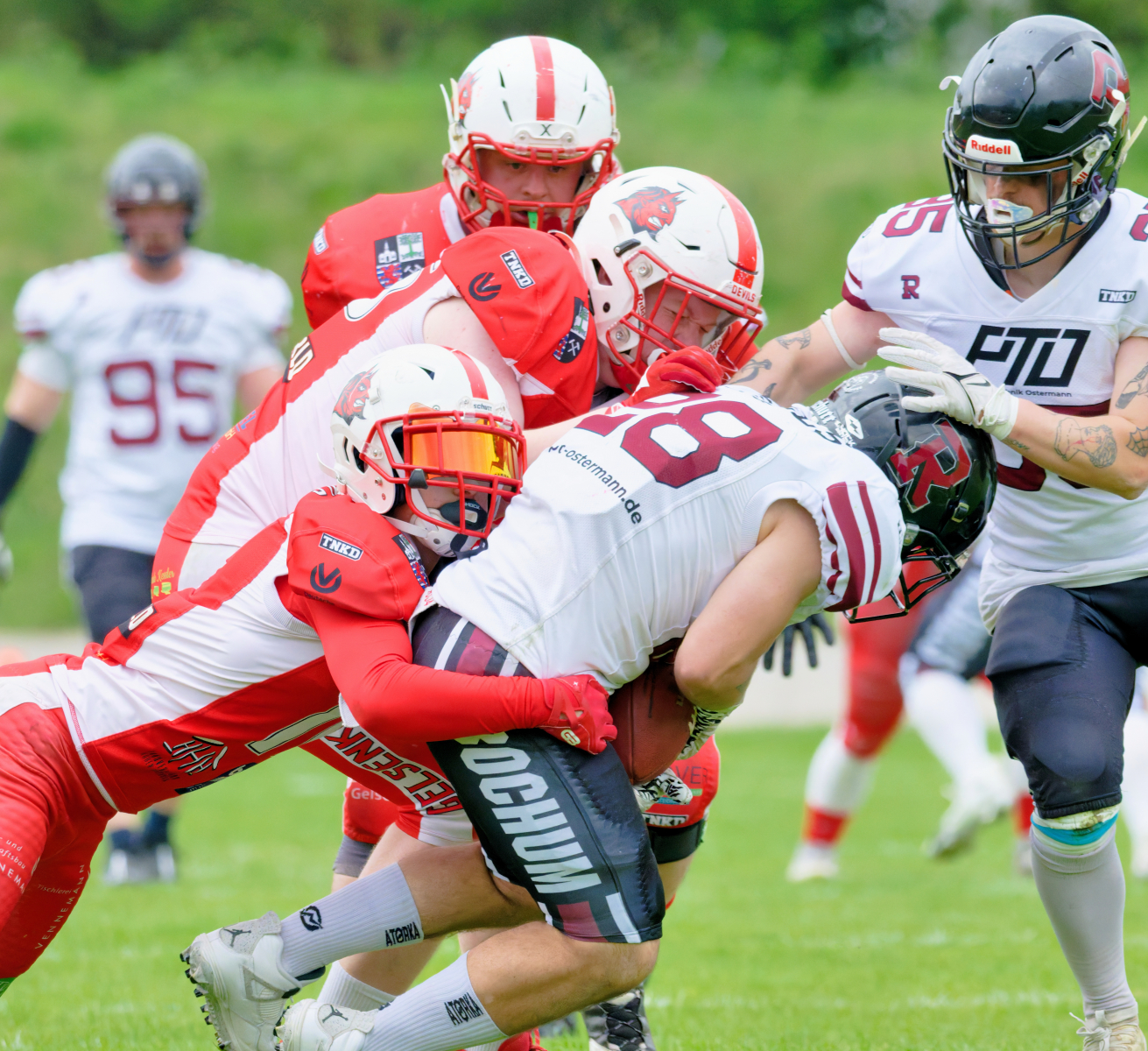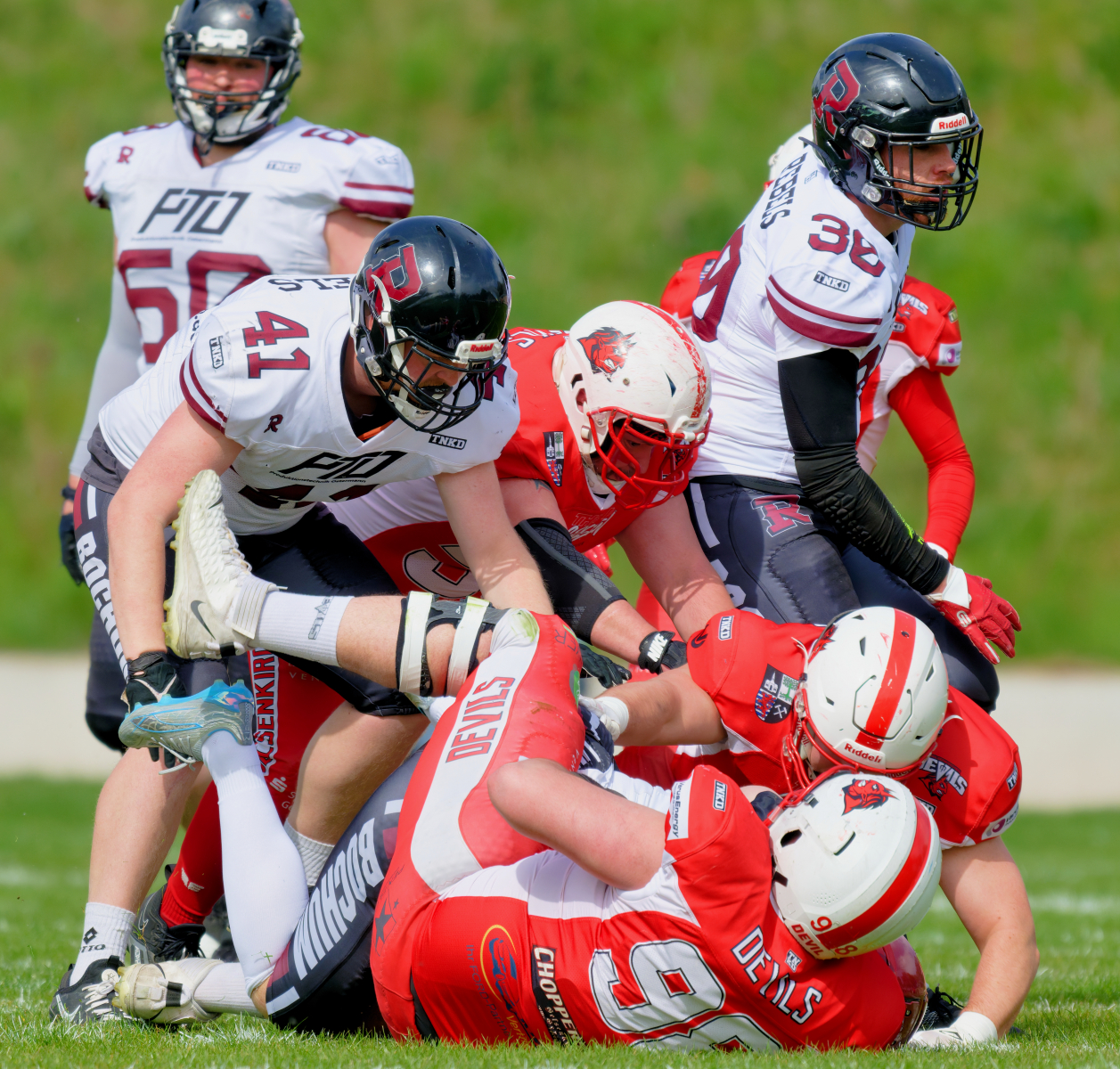 Es folgte zum Ankick um 15:00 Uhr ein Spiel auf Augenhöhe gegen den Oberligisten Bochum Rebels. Beide Teams kämpften in einem offenen Match, doch mit einem glücklicheren Ausgang für die Devils mit einem knappen Sieg von 14:7.