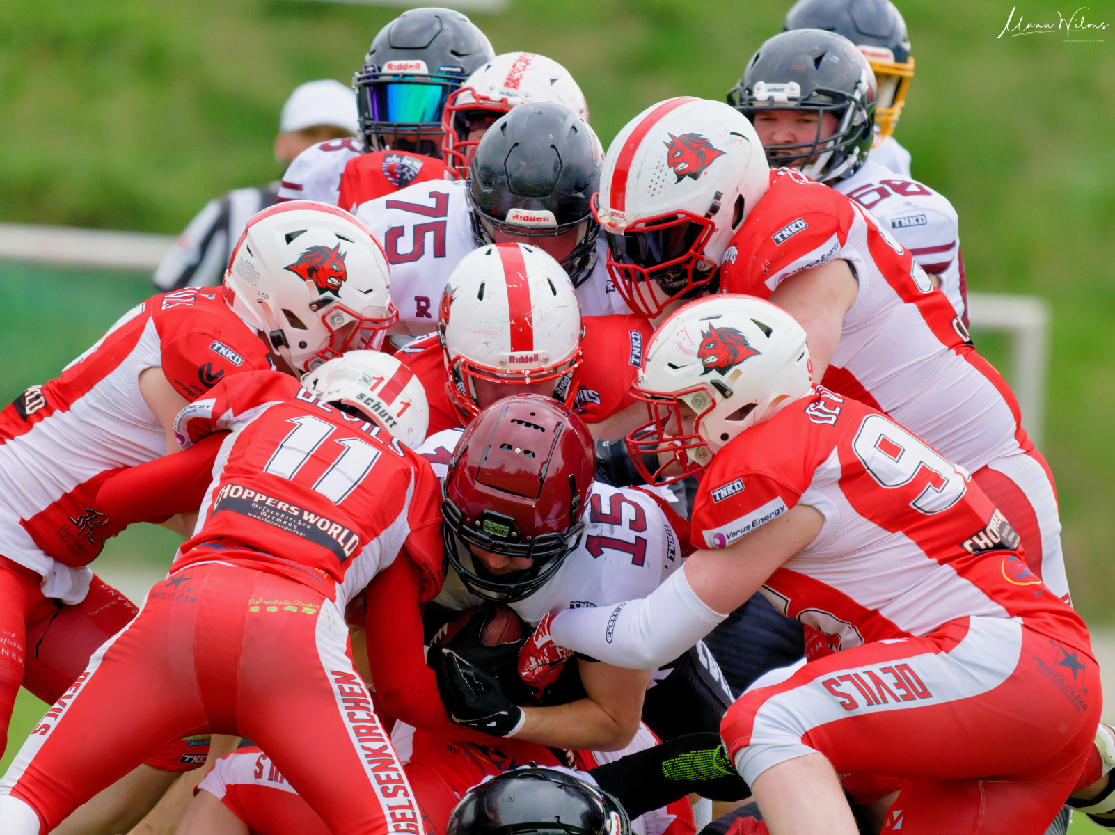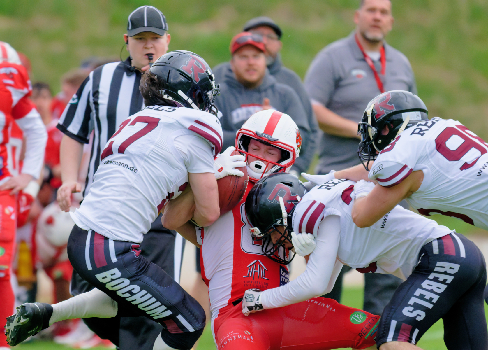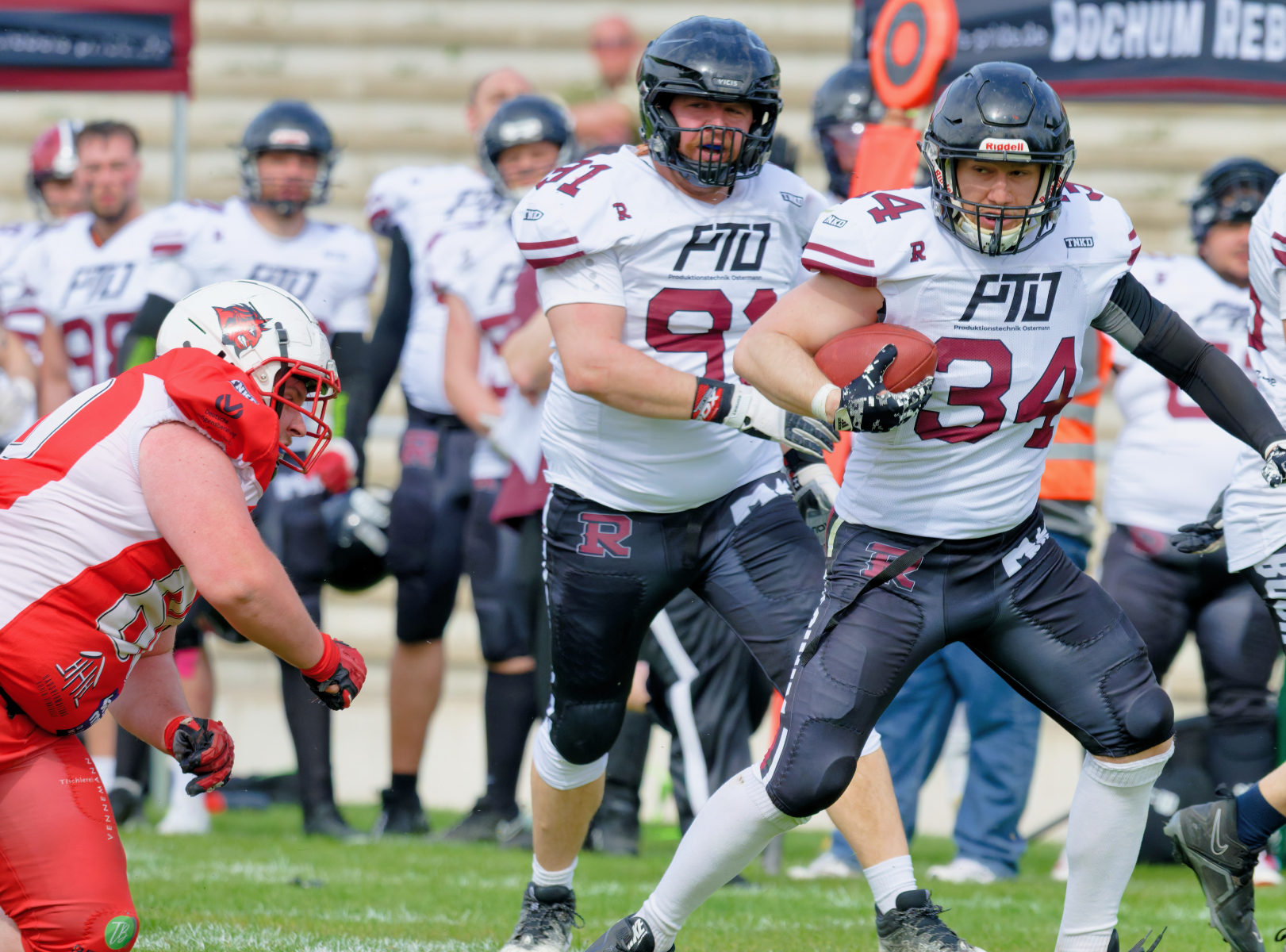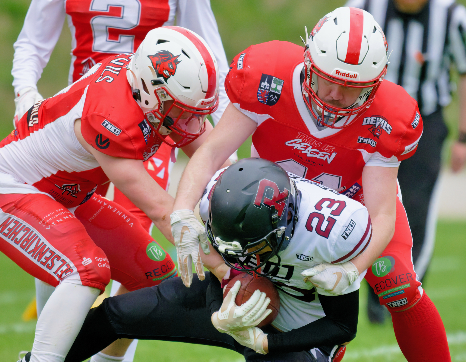 Es folgte zum Ankick um 15:00 Uhr ein Spiel auf Augenhöhe gegen den Oberligisten Bochum Rebels. Beide Teams kämpften in einem offenen Match, doch mit einem glücklicheren Ausgang für die Devils mit einem knappen Sieg von 14:7.