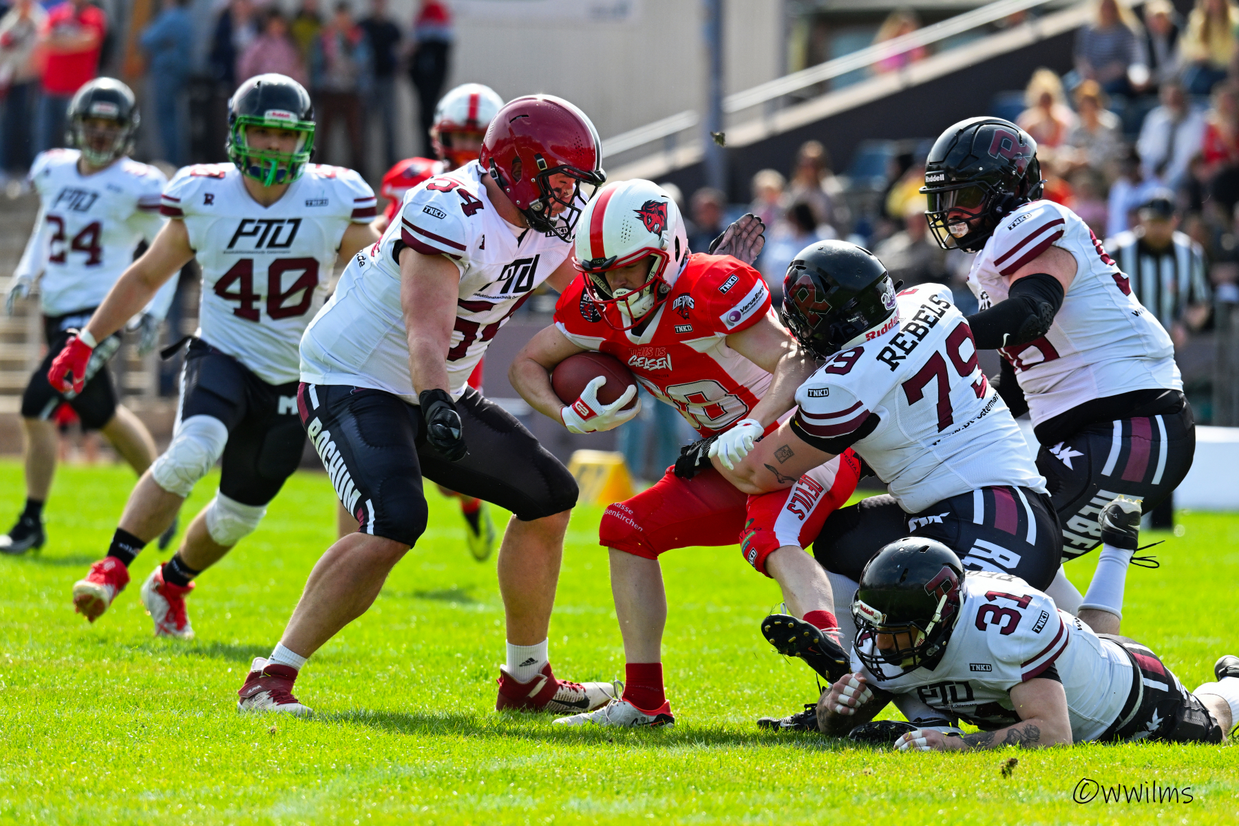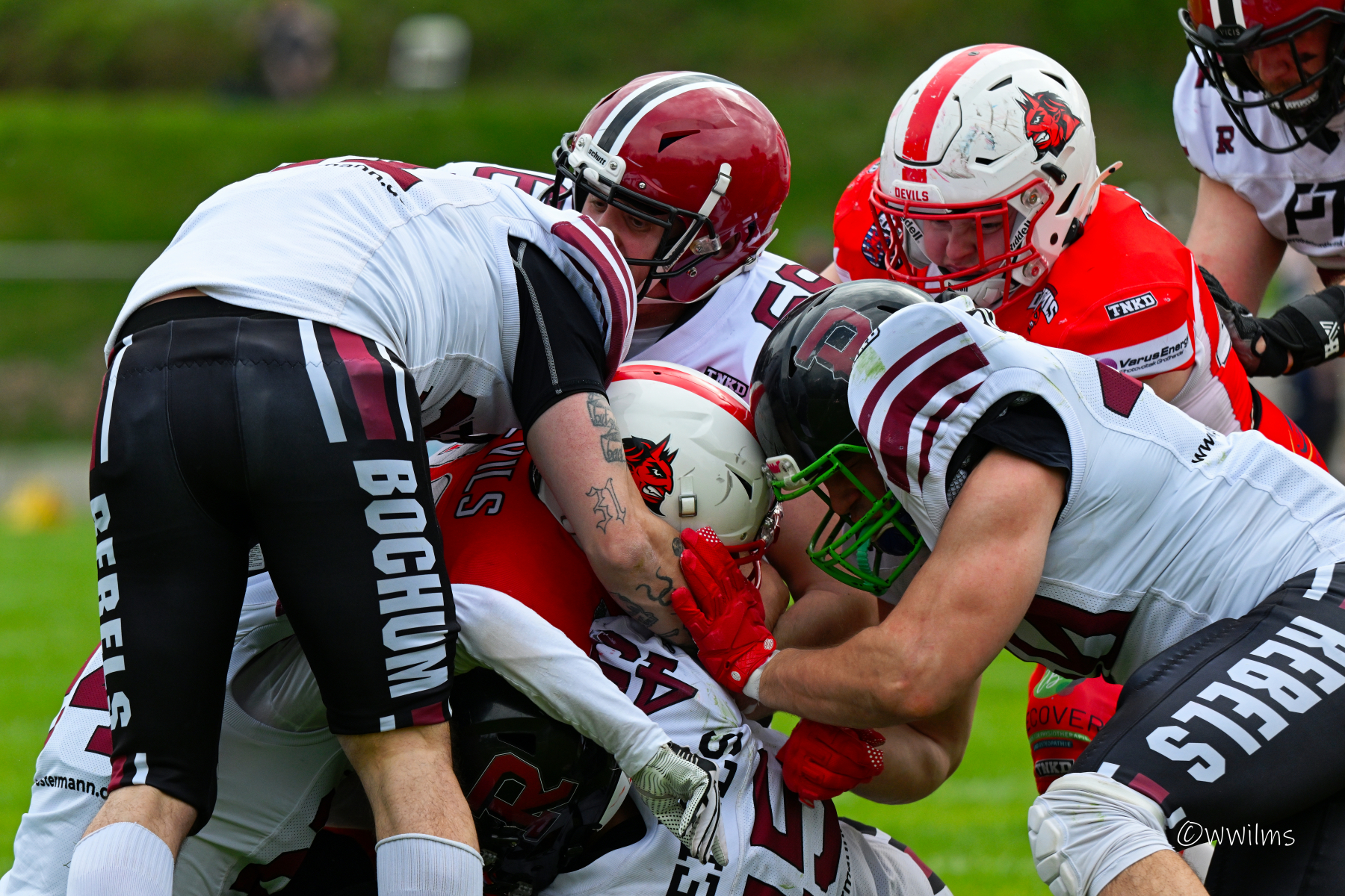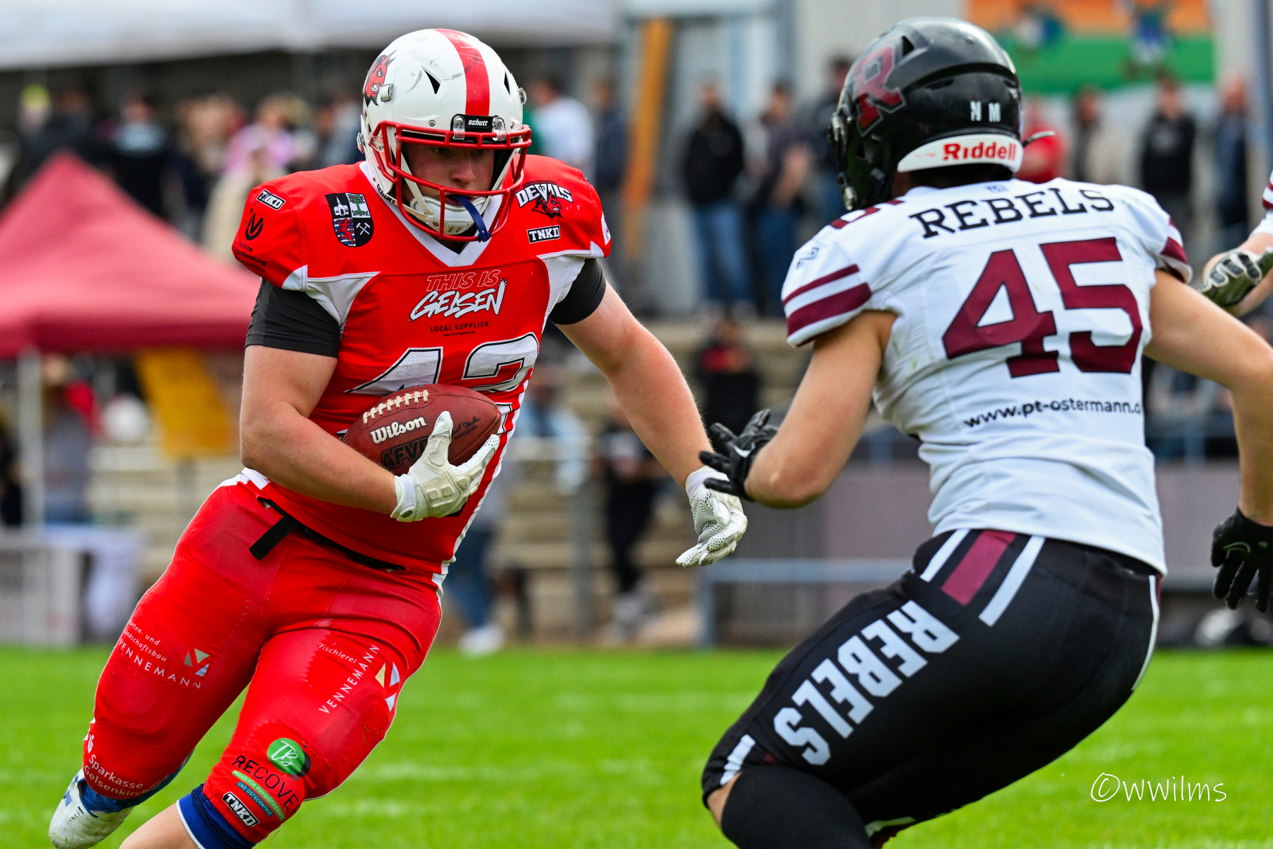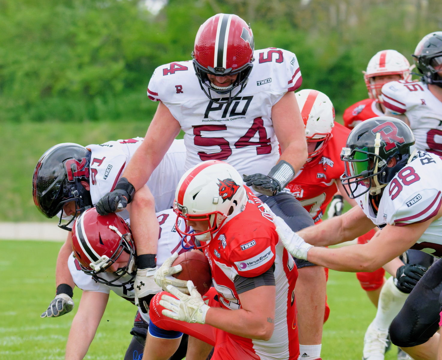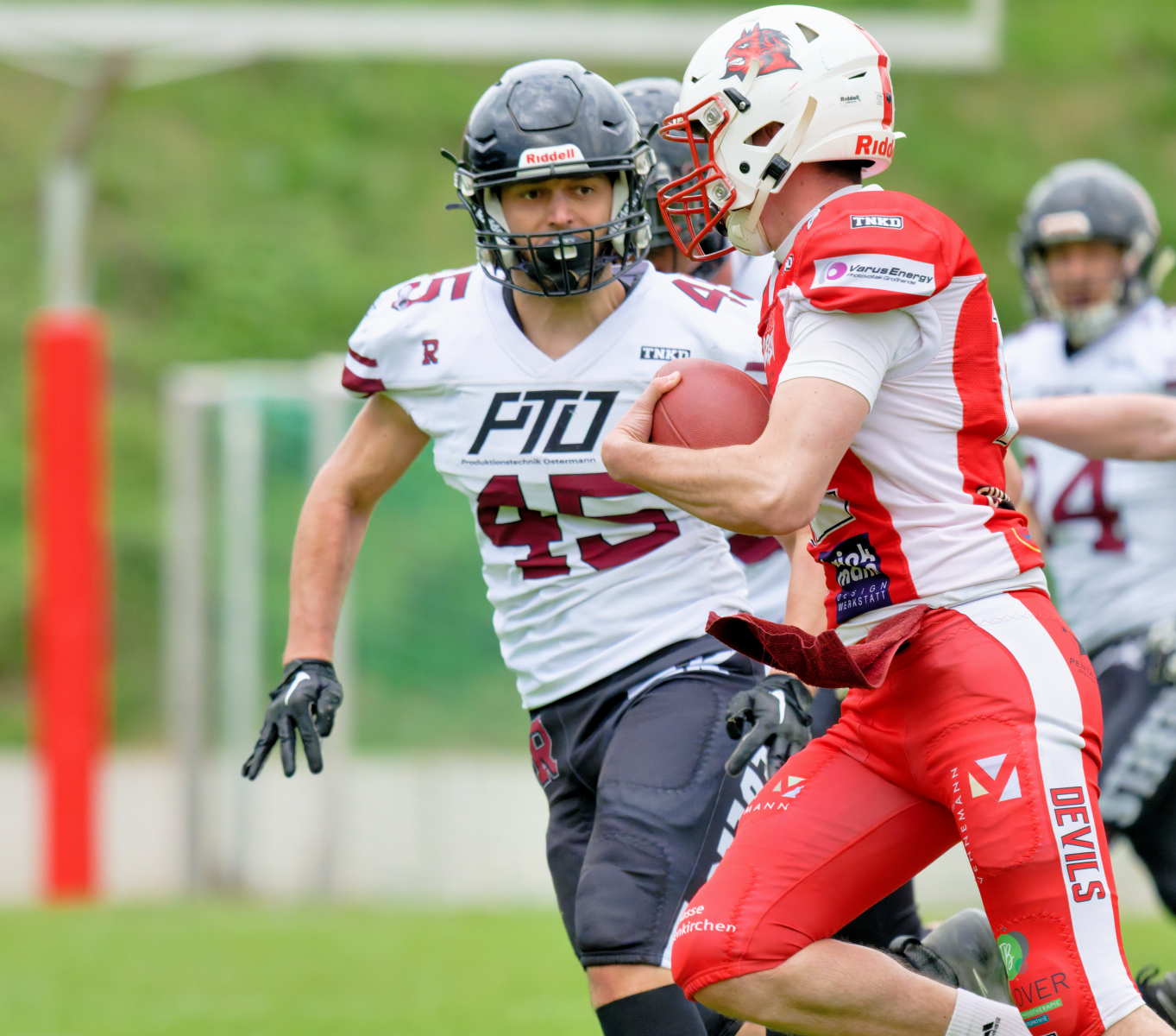 Es folgte zum Ankick um 15:00 Uhr ein Spiel auf Augenhöhe gegen den Oberligisten Bochum Rebels. Beide Teams kämpften in einem offenen Match, doch mit einem glücklicheren Ausgang für die Devils mit einem knappen Sieg von 14:7.