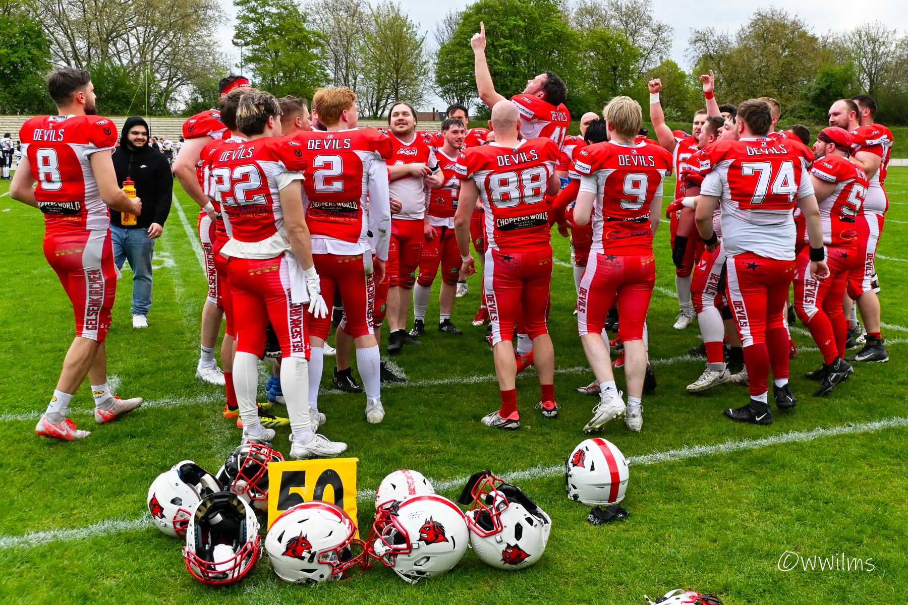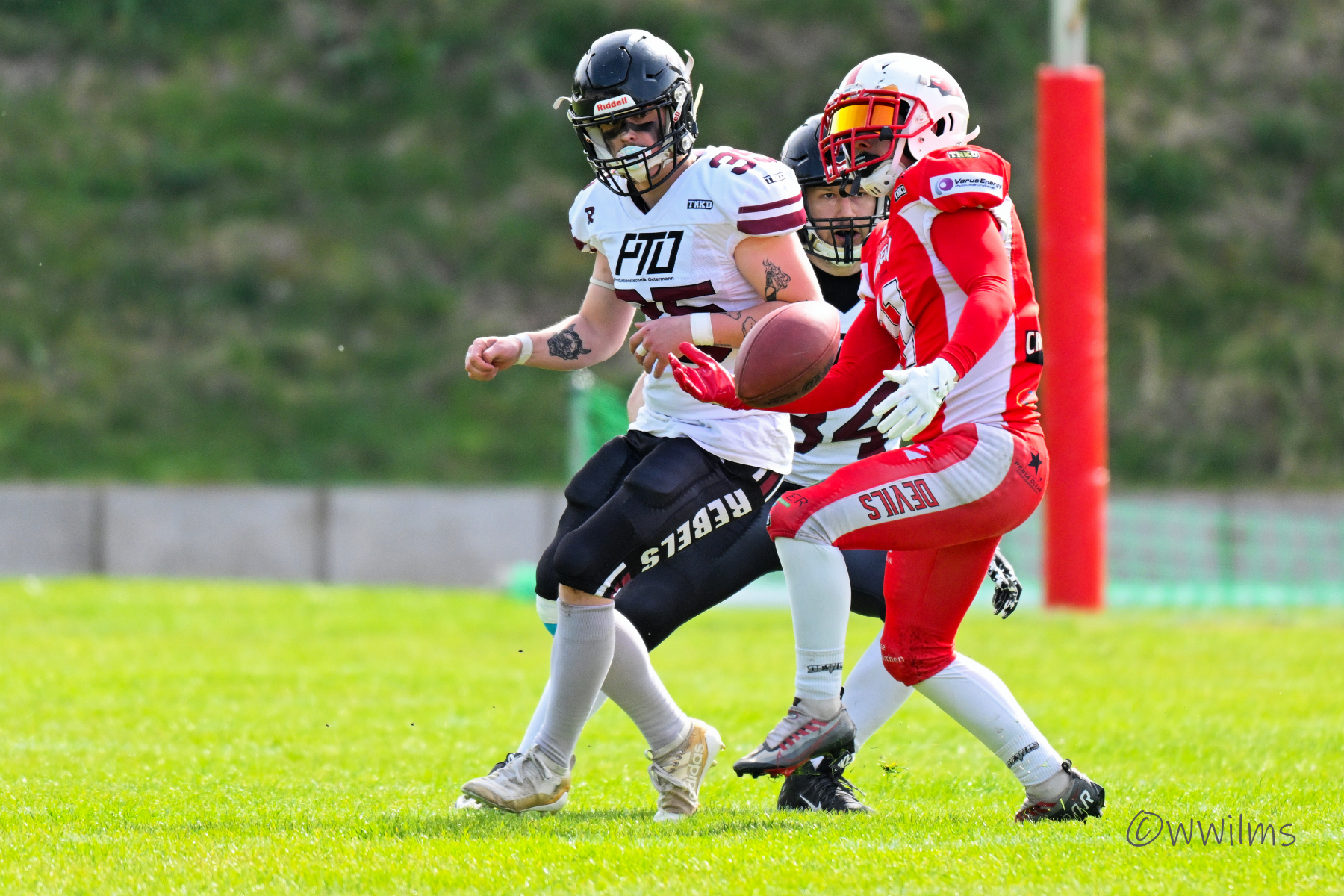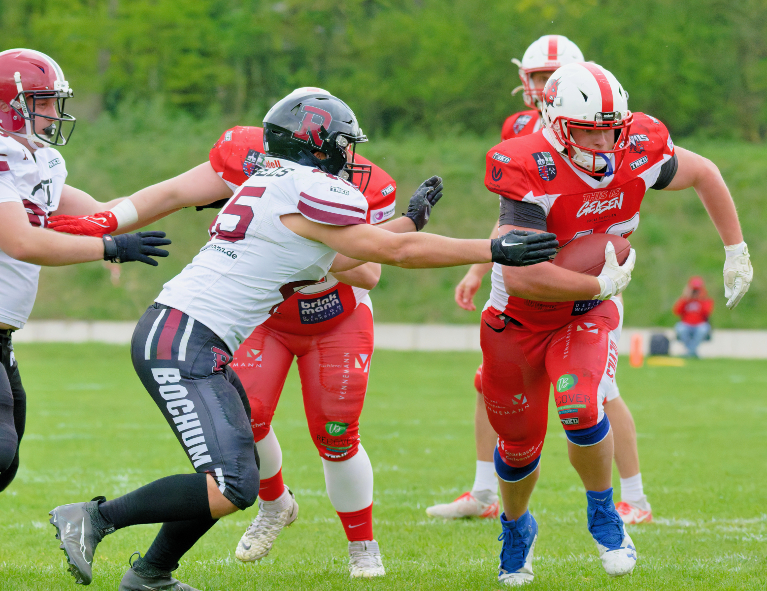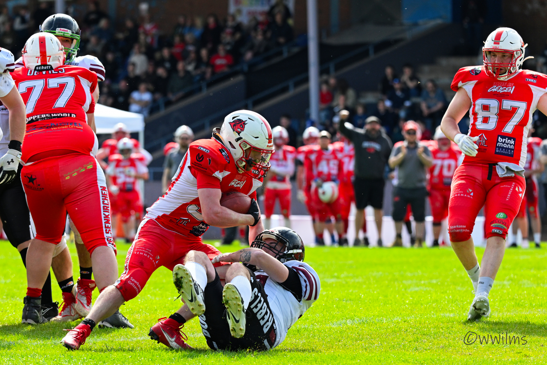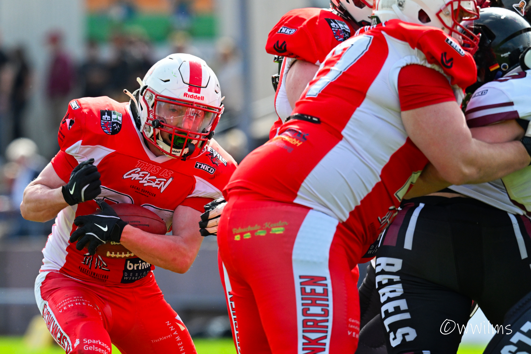 Es folgte zum Ankick um 15:00 Uhr ein Spiel auf Augenhöhe gegen den Oberligisten Bochum Rebels. Beide Teams kämpften in einem offenen Match, doch mit einem glücklicheren Ausgang für die Devils mit einem knappen Sieg von 14:7.