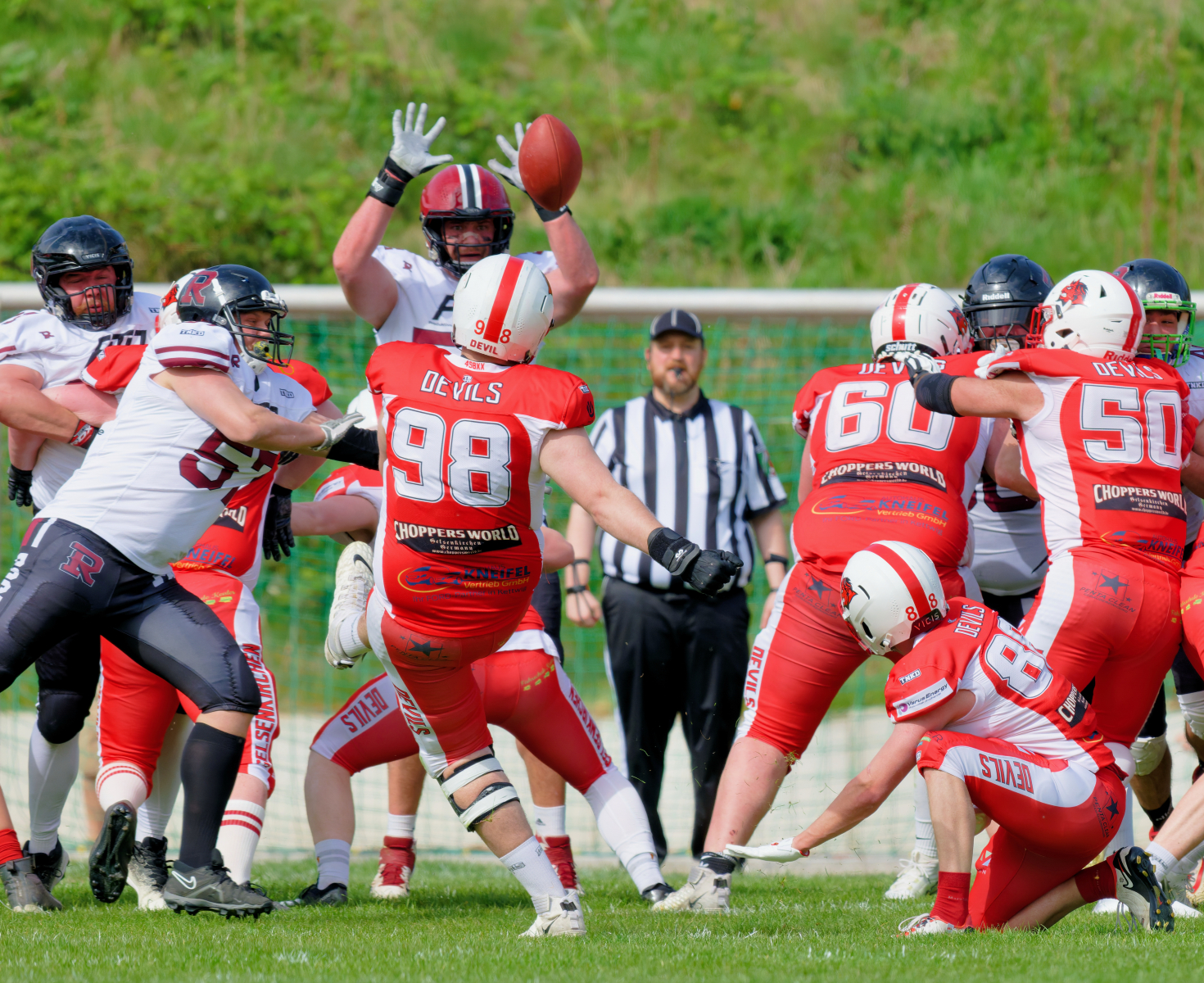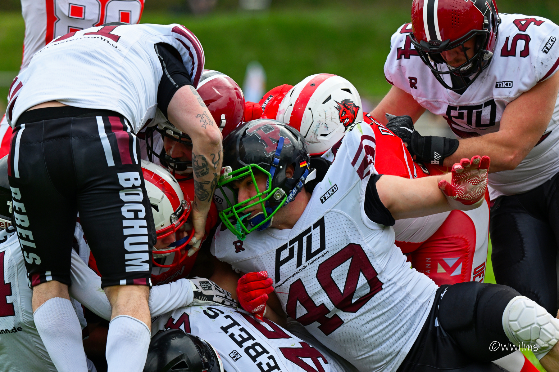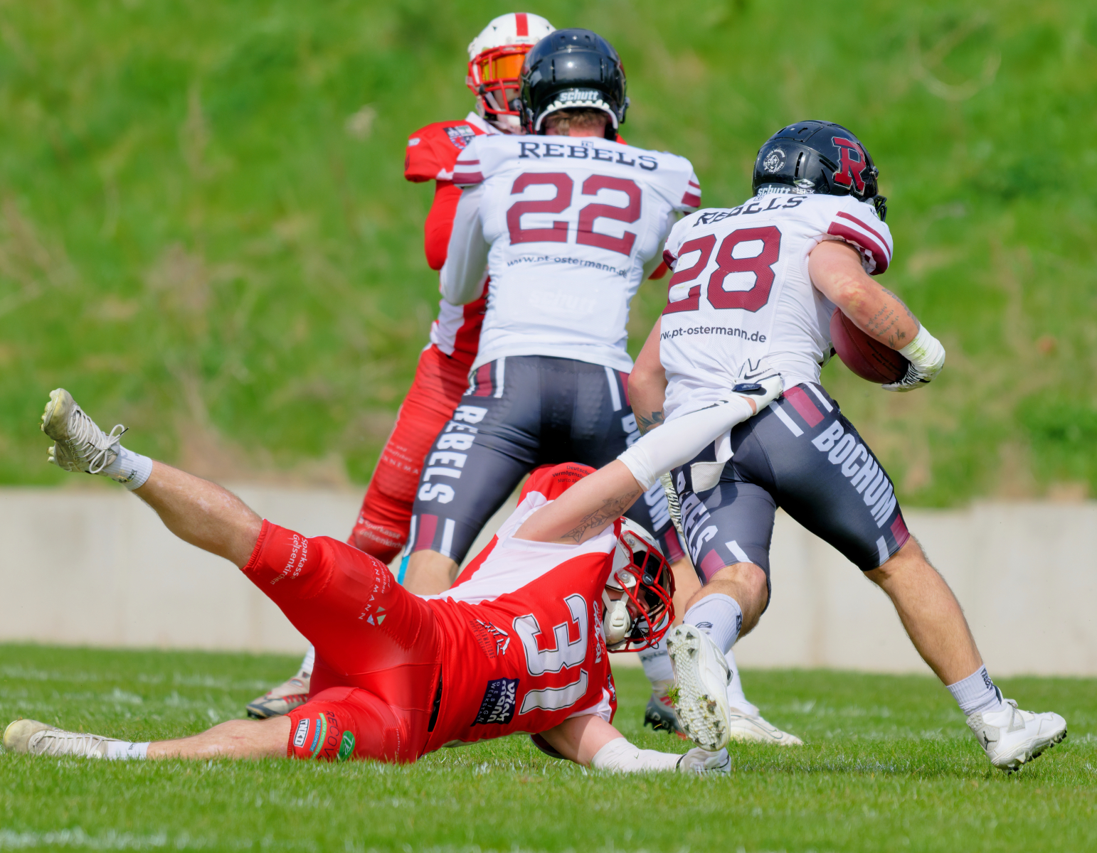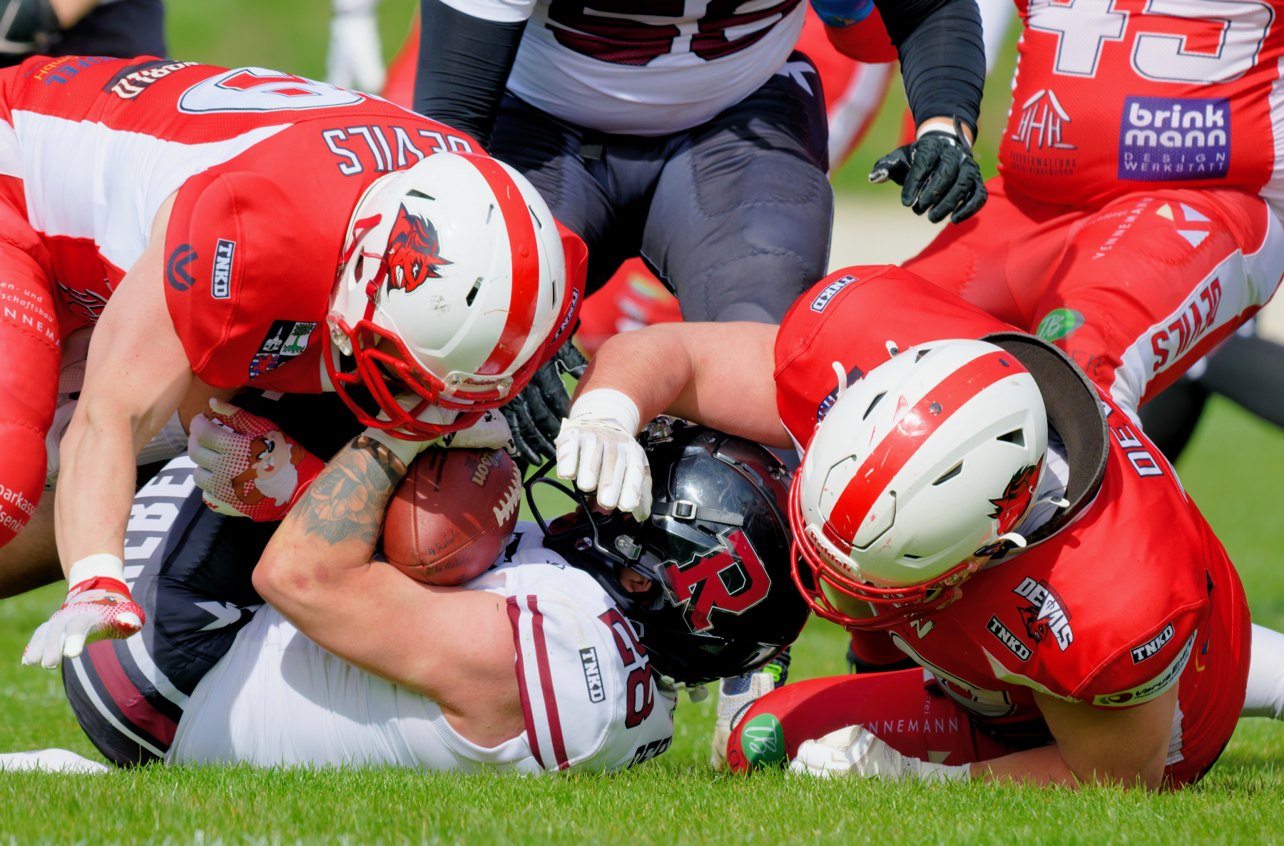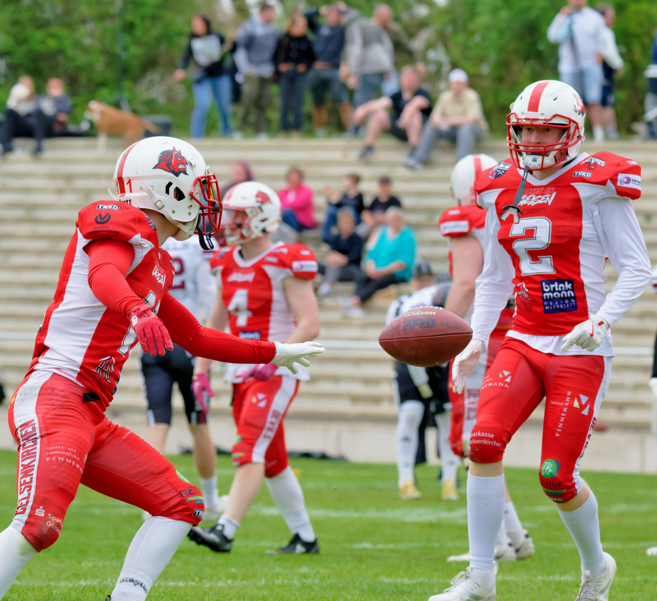 Es folgte zum Ankick um 15:00 Uhr ein Spiel auf Augenhöhe gegen den Oberligisten Bochum Rebels. Beide Teams kämpften in einem offenen Match, doch mit einem glücklicheren Ausgang für die Devils mit einem knappen Sieg von 14:7.