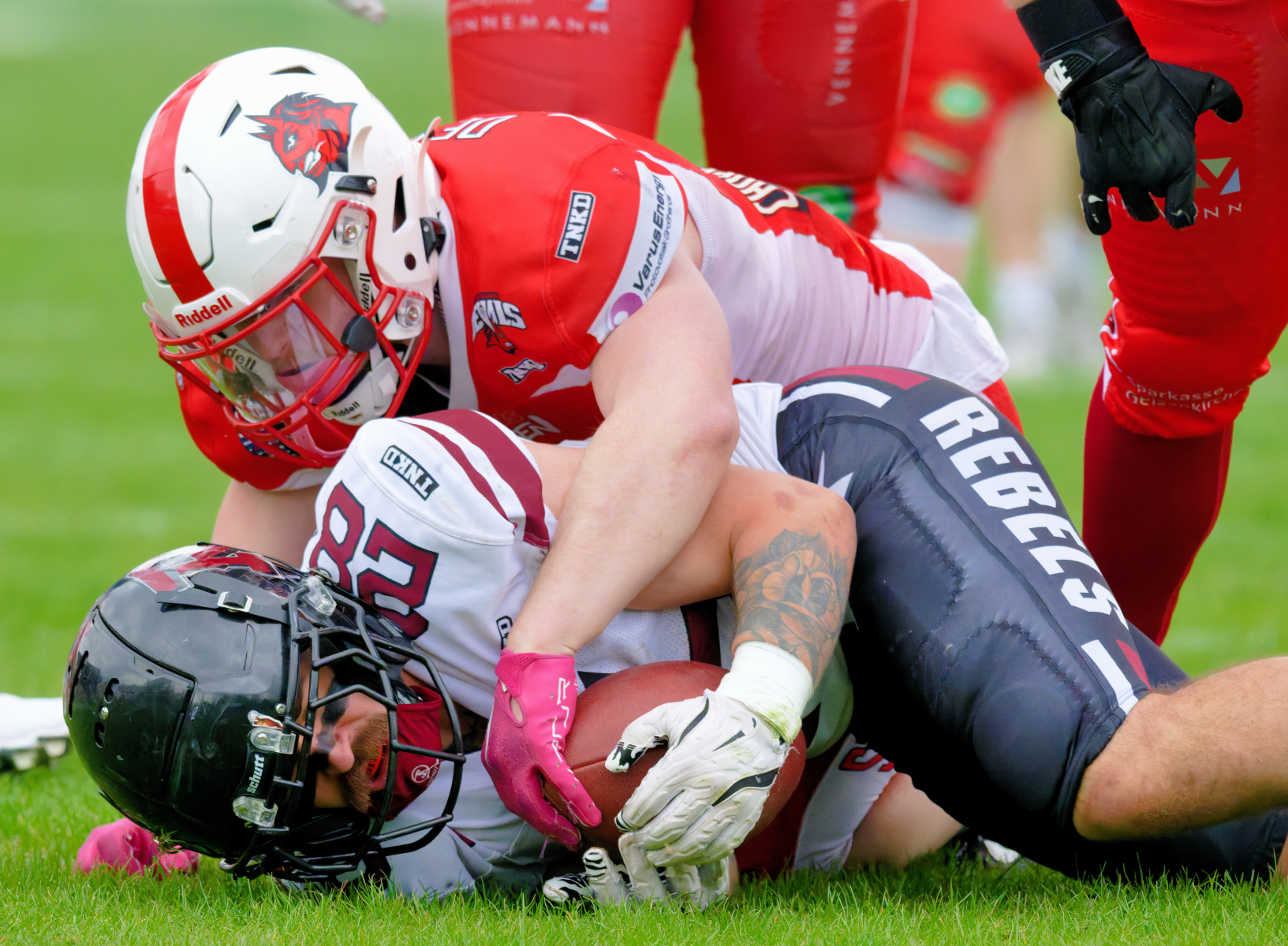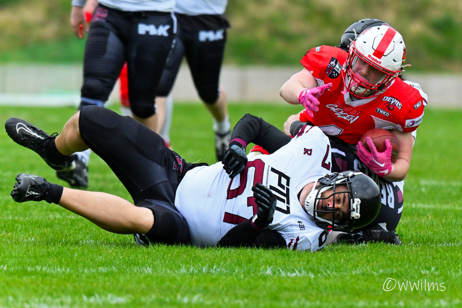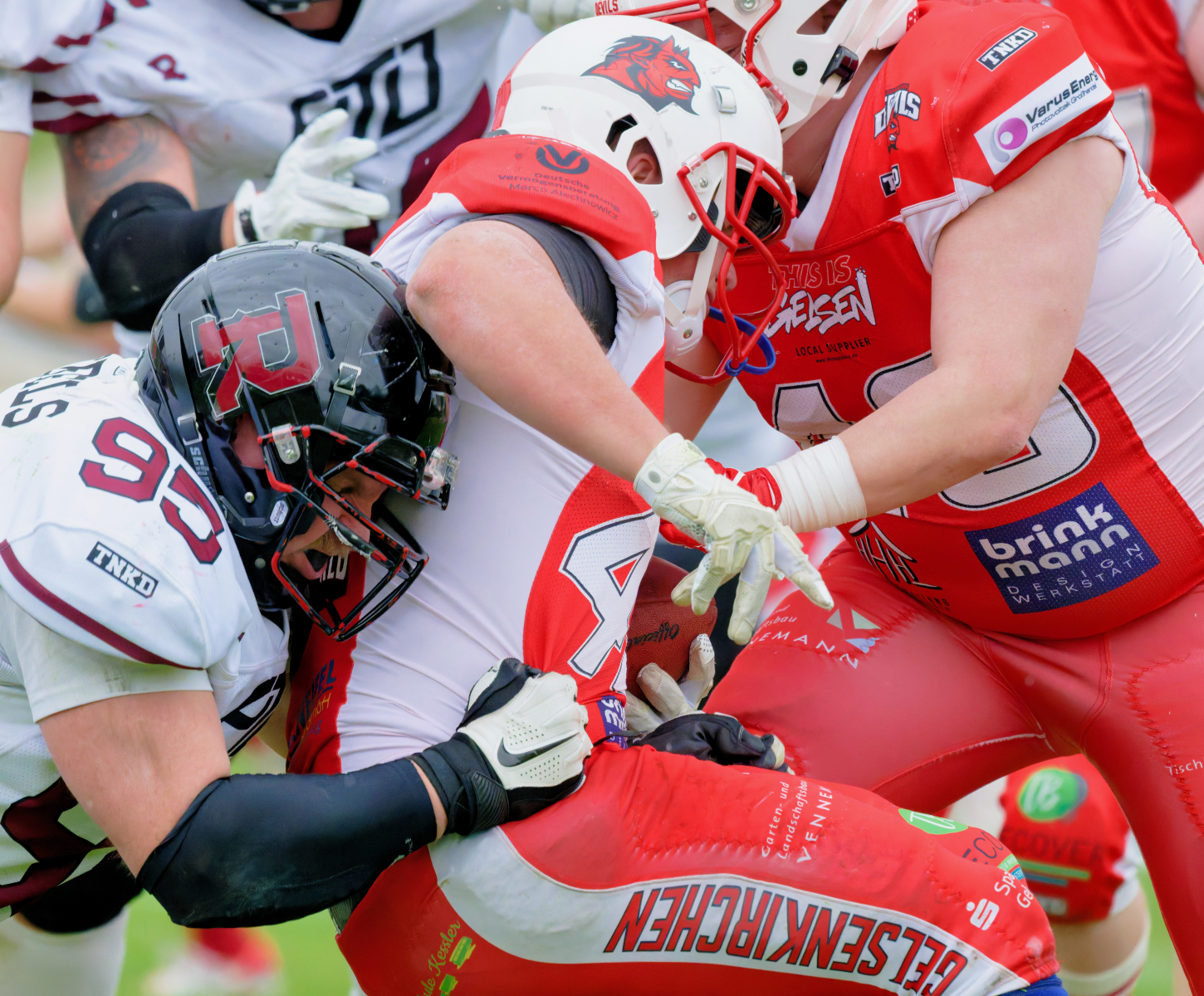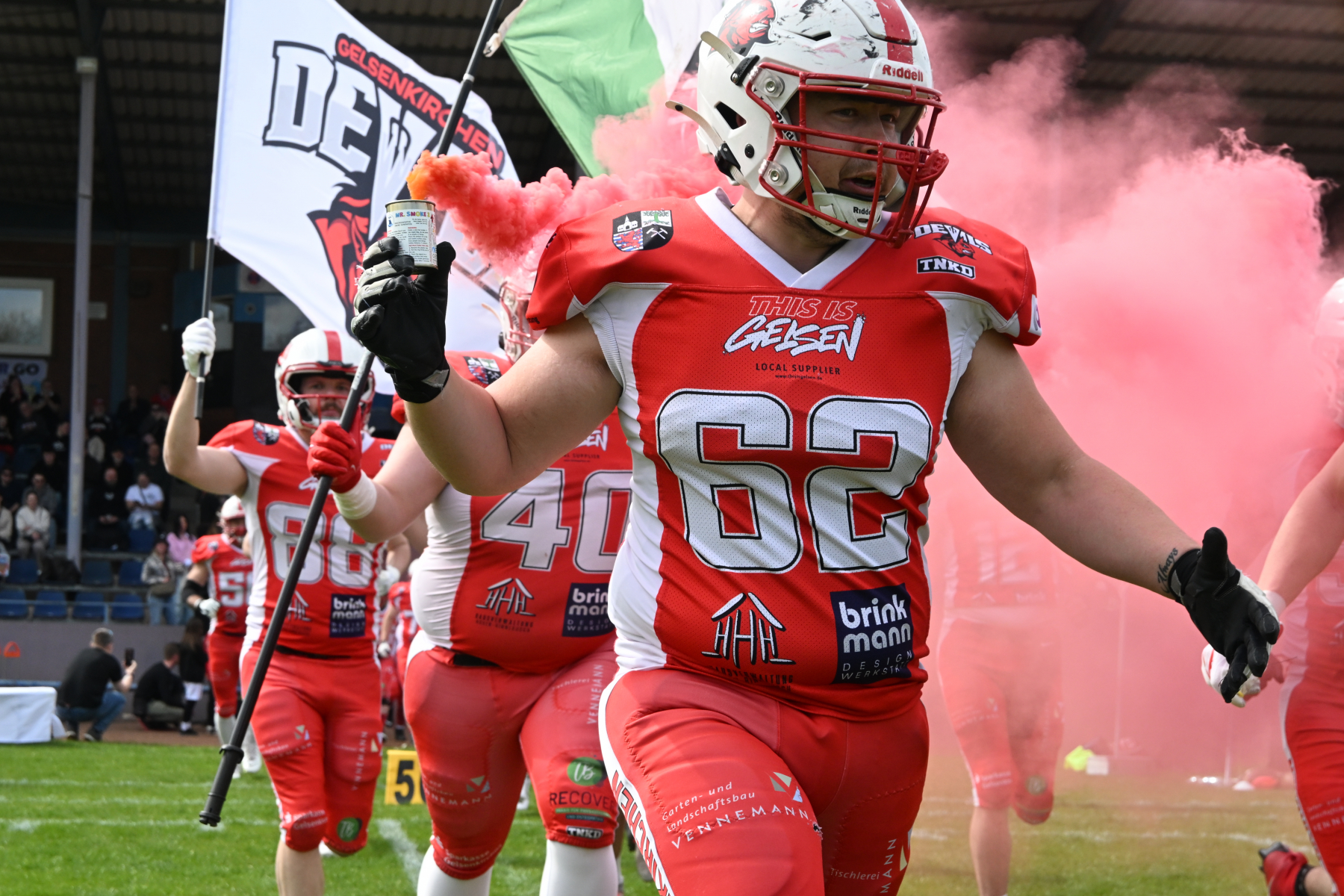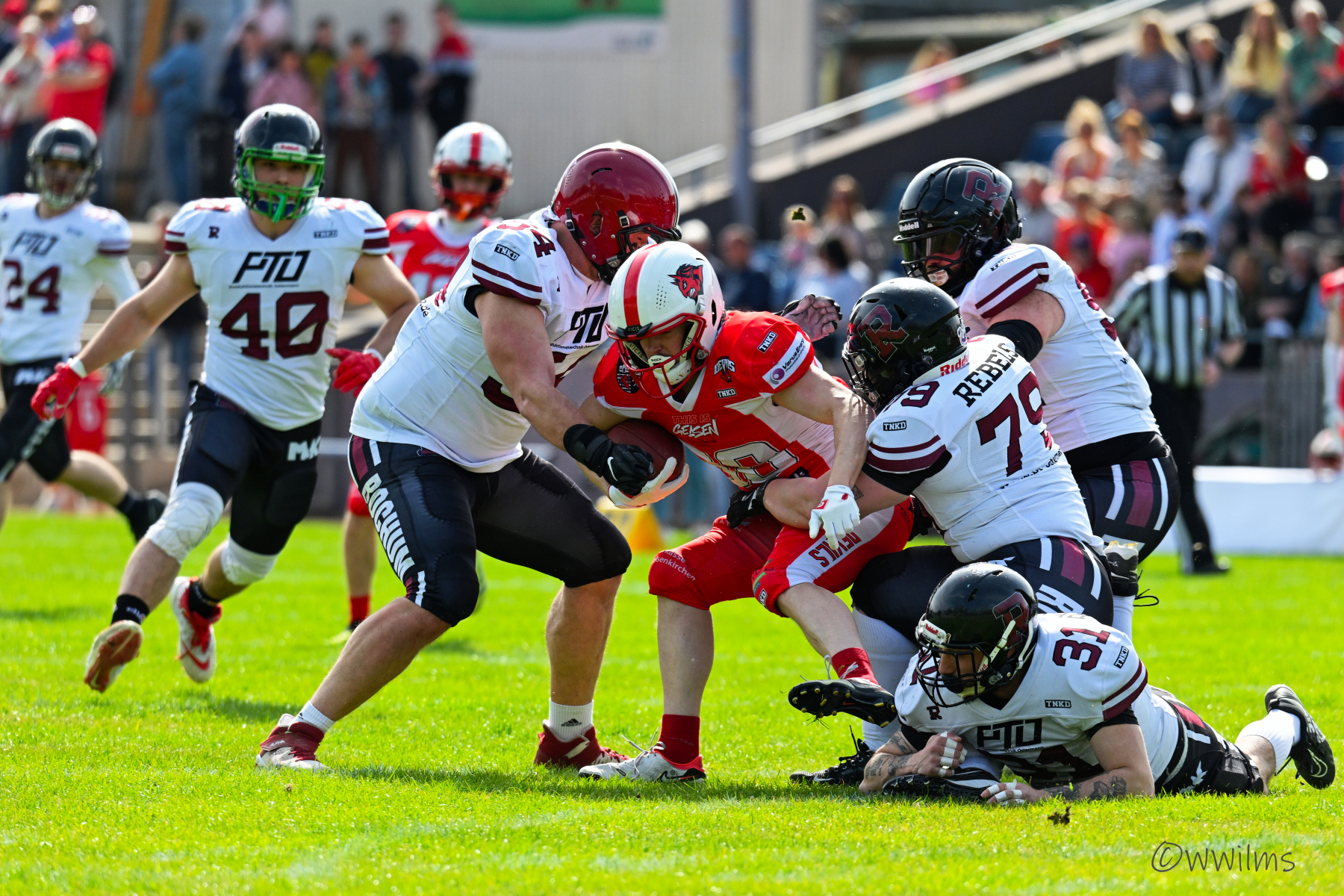 Es folgte zum Ankick um 15:00 Uhr ein Spiel auf Augenhöhe gegen den Oberligisten Bochum Rebels. Beide Teams kämpften in einem offenen Match, doch mit einem glücklicheren Ausgang für die Devils mit einem knappen Sieg von 14:7.